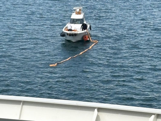 納入作業船と新造船の間に停まっている船を
